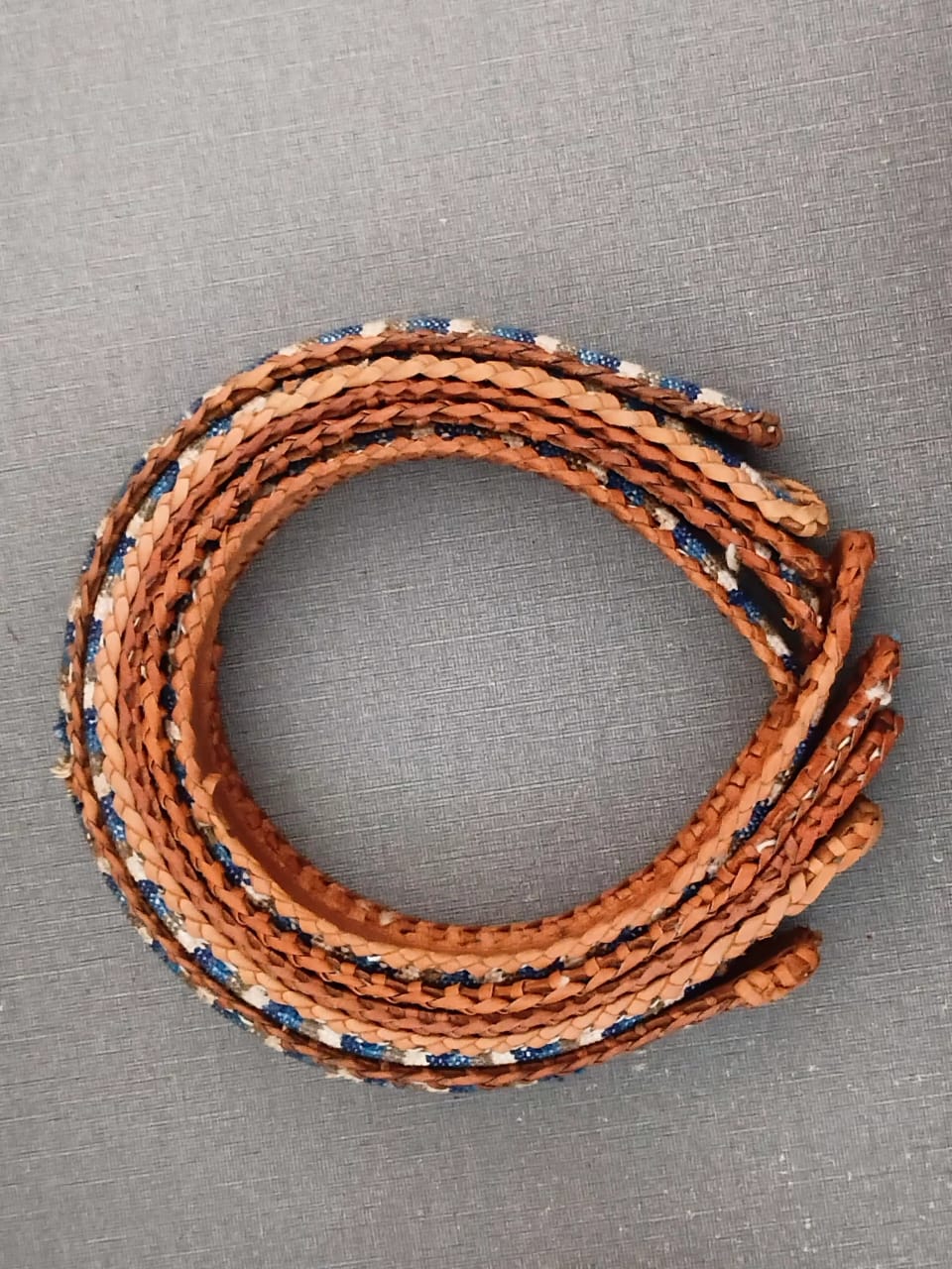 Contrasting Textures: High-quality cognac-colored leather braids are interspersed with unique blue and white patterned fabric weaves for a sophisticated pop of color.