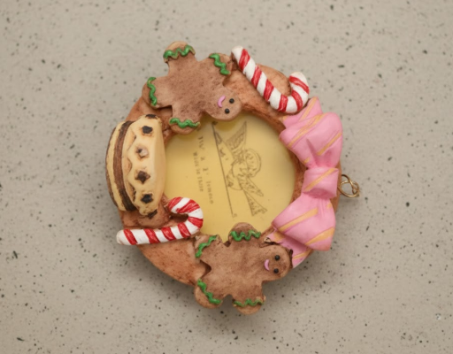 Add a dash of festive sweetness to your holiday tree with our Gingerbread Sweet Treats Ornament Frame. This delightful circular wreath is a confectionery dream, meticulously crafted from hand-painted resin to look like a freshly baked holiday cookie. Adorned with smiling gingerbread men, classic candy canes, a decadent chocolate chip cookie, and a vibrant pink oversized bow, it perfectly captures the cozy, whimsical spirit of a traditional Christmas kitchen.