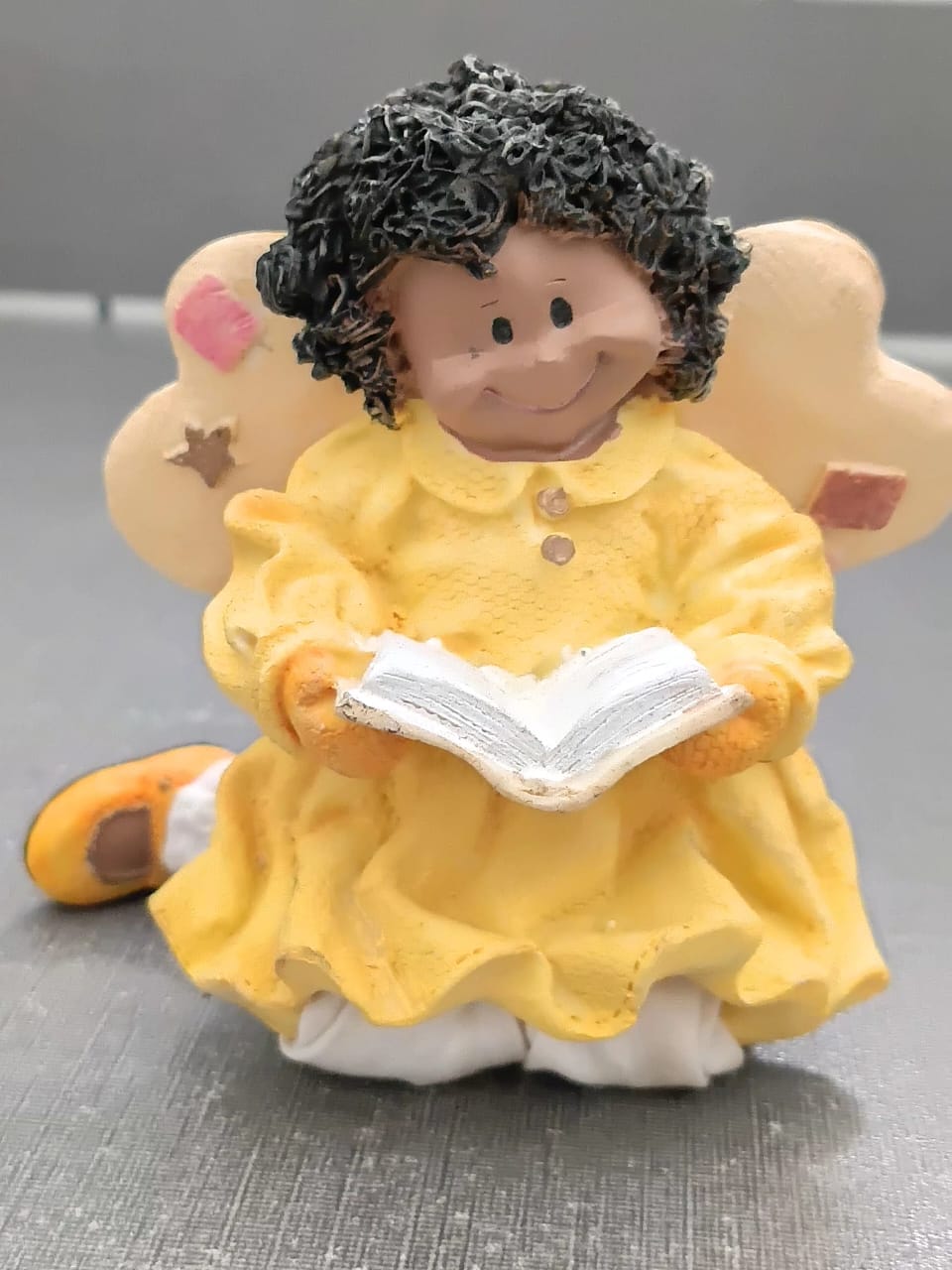 Add a heartwarming glow to your home with the “Little Reader” Angel Figurine. This charming collectible features a sweet angel with dark curly hair and a joyful expression, dressed in a bright, sunny yellow dress while intently reading an open book. The soft, scalloped wings are adorned with whimsical heart and star accents, making it a perfect gift for readers, teachers, or anyone who appreciates a touch of celestial inspiration.