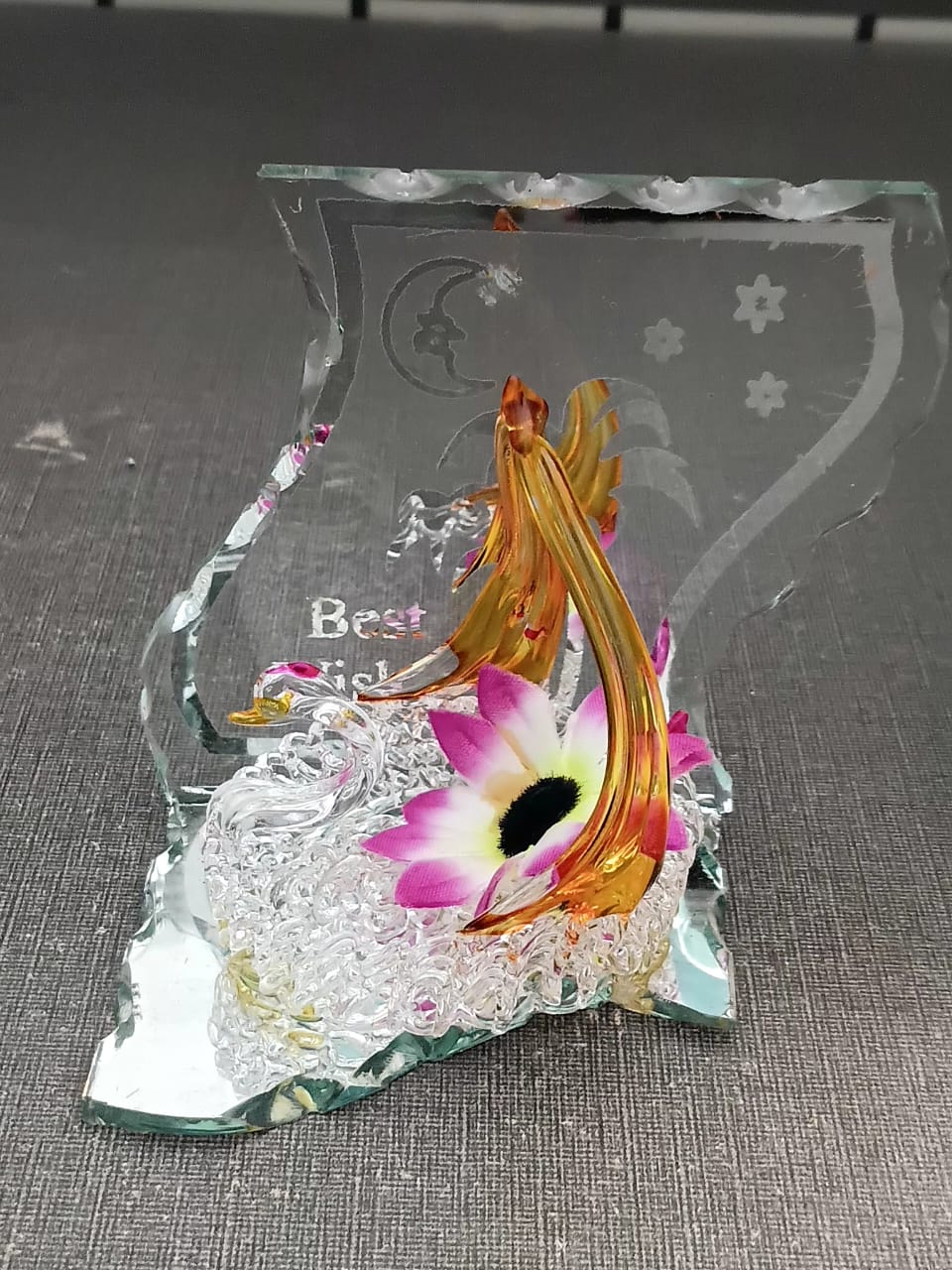 Intricate Etched Backdrop: A beautifully contoured glass pane features a frosted celestial scene, including a crescent moon and stars, alongside the timeless sentiment “Best Wishes.”
