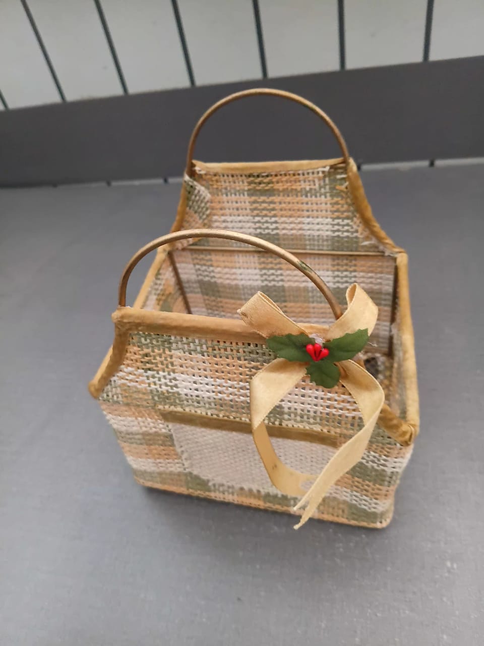 Add a touch of nostalgic holiday cheer to your home with our “Holly & Harvest” Gingham Market Caddy. This charming woven organizer features a classic plaid pattern in soft earthy tones of sage green, cream, and apricot. Designed with a sturdy, structured frame and dual metallic gold-tone handles, this caddy is as functional as it is decorative.
