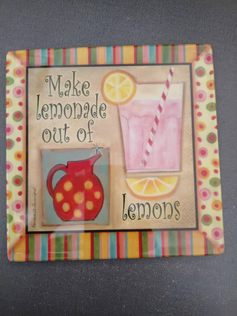 Brighten your kitchen with a squeeze of optimism. This beautifully crafted glass trivet is more than just a surface protector—it’s a vibrant piece of functional art. Featuring the classic motivational quote “When Life Gives You Lemons, Make Lemonade,” the design showcases a charming red-and-white polka dot pitcher filled with refreshing lemonade, surrounded by citrus slices and cheerful red accents.
